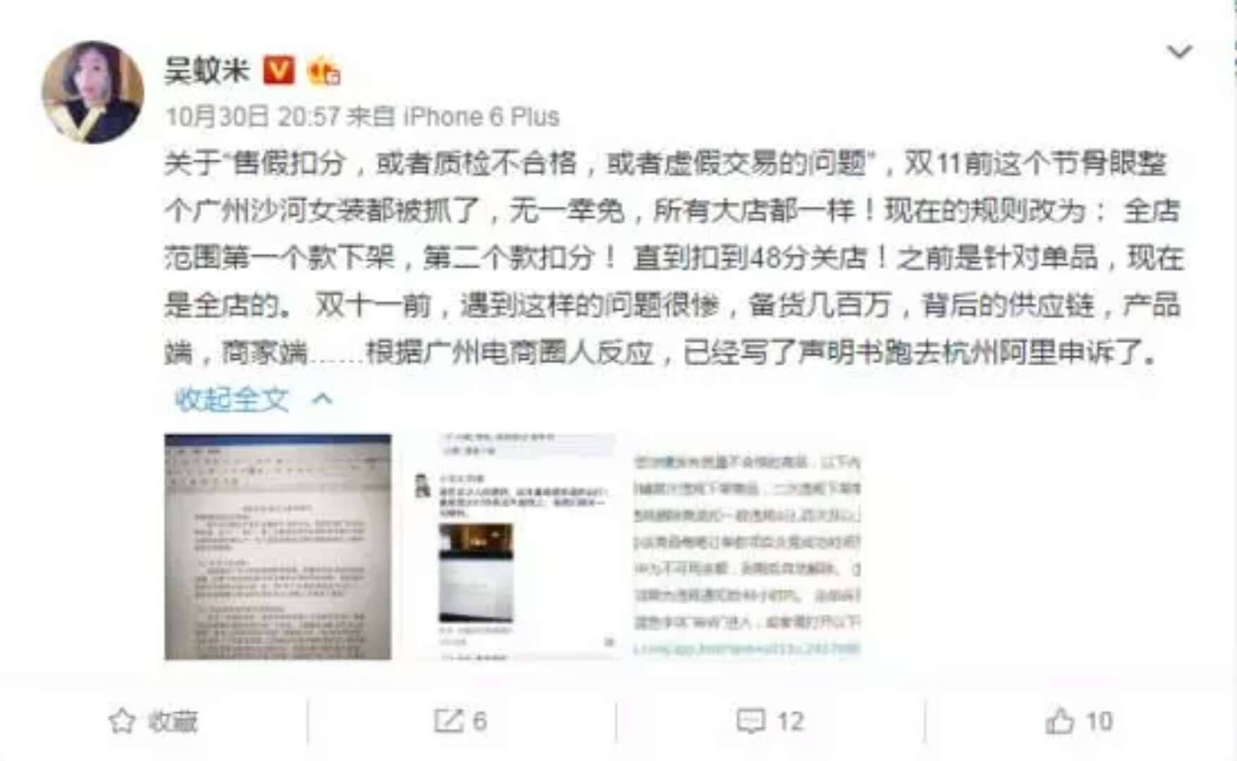 据电商自媒体吴蚊米爆料,双11前夕,淘宝再次加大对“售假扣分、质检不合格、虚假交易”的严查,部分广州沙河地区的淘宝女装遭受到严查。除此之外,中山地区的卖家也受到影响,一些大小家电类目也受到严查。小宋和小陈所在的濮院镇因主打高端针织品,此次波及较小。