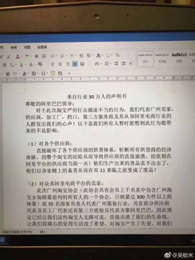 “本次阿里严厉打击描述不当的行为,对于供应商来说,直接破坏了各个供应商的供货体系,斩断了所有供应商的经济命脉。对于众多阿里电商平台的卖家来说,此次规定让我们这些淘宝人无路可走,直接击溃了我们的生命线,让我们很痛心的觉得生活没了希望,对淘宝产生了失望。”
